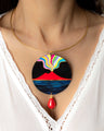 Il ciondolo è sorretto da un collier rigido in acciaio dorato e completato da una goccia rossa che scende come un battito, un segno d’amore eterno per la propria terra.