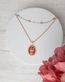 Il dipinto è incorniciato da una montatura intarsiata in lega semipreziosa dorata, e completato da una doppia catenina in acciaio dorato, impreziosita da piccoli inserti sferici che ne esaltano la grazia.