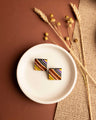 Linee, punti e trame si alternano su una base quadrata in una composizione tribale dai colori intensi: ocra, arancio bruciato, viola e nero si intrecciano con ritmo e calore.