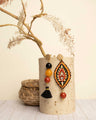 Un monile che unisce la maestria dell'artigianato con l'eleganza delle pietre naturali. Da un lato, un motivo dipinto a mano in toni caldi di arancio, rosso e nero crea un disegno geometrico affascinante, mentre dall'altro, una sequenza di pietre di agata — nere, arancioni e rosse — si alternano, culminando in una pietra più grande, che aggiunge profondità e colore. Un delicato nappino nero completa il design, conferendo movimento e un tocco etnico-chic