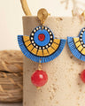 Forme semicircolari dipinte a mano con cura artigianale si aprono come raggi stilizzati. Il blu intenso, l’oro e il rosso si incontrano in un equilibrio vivace, scandito da piccoli punti bianchi che danzano come note su una melodia visiva.Una sfera di agata rossa, sfaccettata e luminosa, completa il disegno con un tocco deciso e raffinato, mentre il gancio dorato a spirale aggiunge luce e movimento.